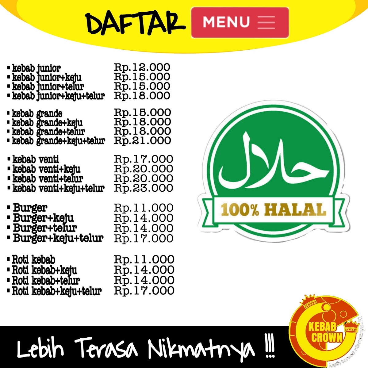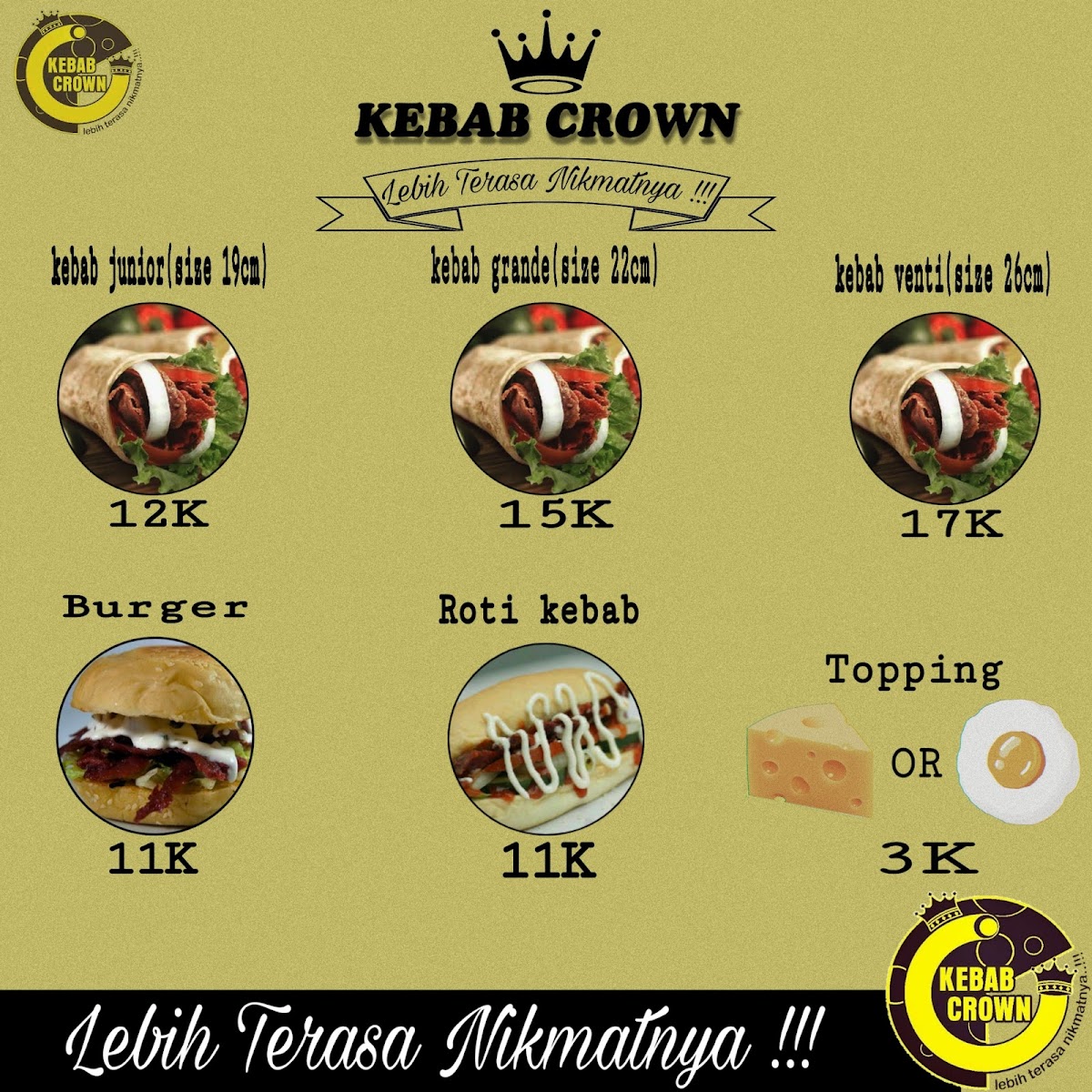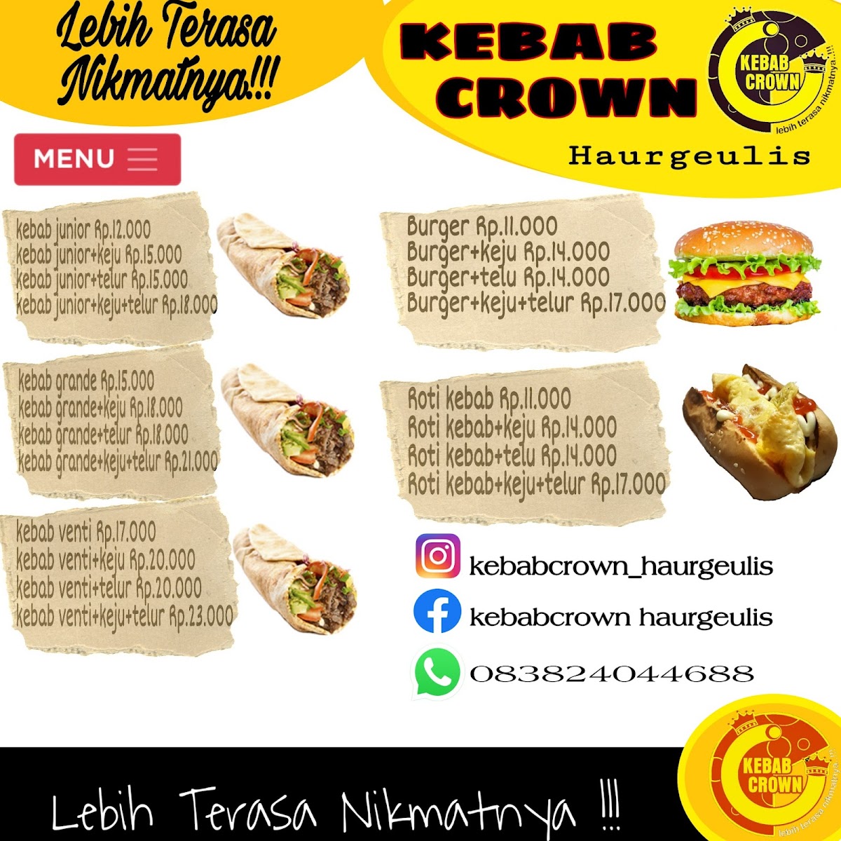 Kebab Crown Haurgeulis is a standout kebab shop located in the heart of Haurgeulis, Indramayu. This cozy spot brings fresh, flavorful kebabs that satisfy every craving. Their menu highlights include the Kebab Junior, a smaller kebab filled with tender meat, crisp lettuce, cucumber, and onions, dressed with customizable spicy sauce, mayonnaise, and tomato ketchup. For a heartier appetite, the Kebab Grande offers a larger portion, featuring smoked meat paired with the same fresh vegetables and sauces.
